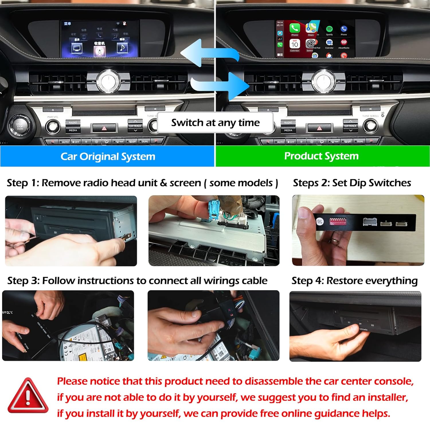 This is a CarPlay add-on module (also known as CarPlay adapter/module/decoder) enables wireless Apple CarPlay & Android Auto to your Lexus factory screen and retain all your factory features, you can switch freely between the factory interface and the CarPlay interface All factory features — including the OEM menus, radio, Bluetooth, and backup camera — are fully retained.